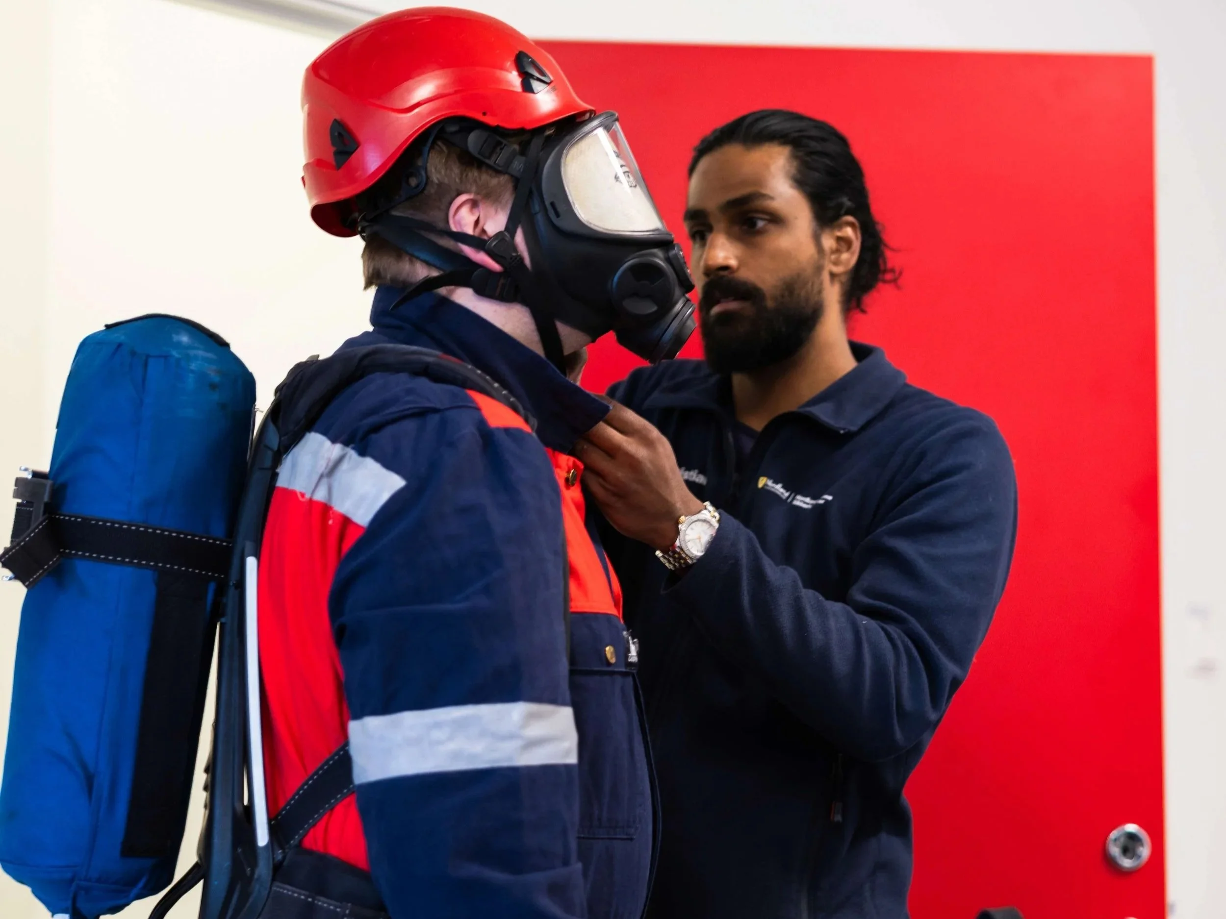 En kursdeltaker gjøres klar til å forsere labyrinten som forestiller innsiden av en båt, ikledd røykdykkerutstyr. Legg merke til maska, den er blendet så han må bevege seg i blinde.